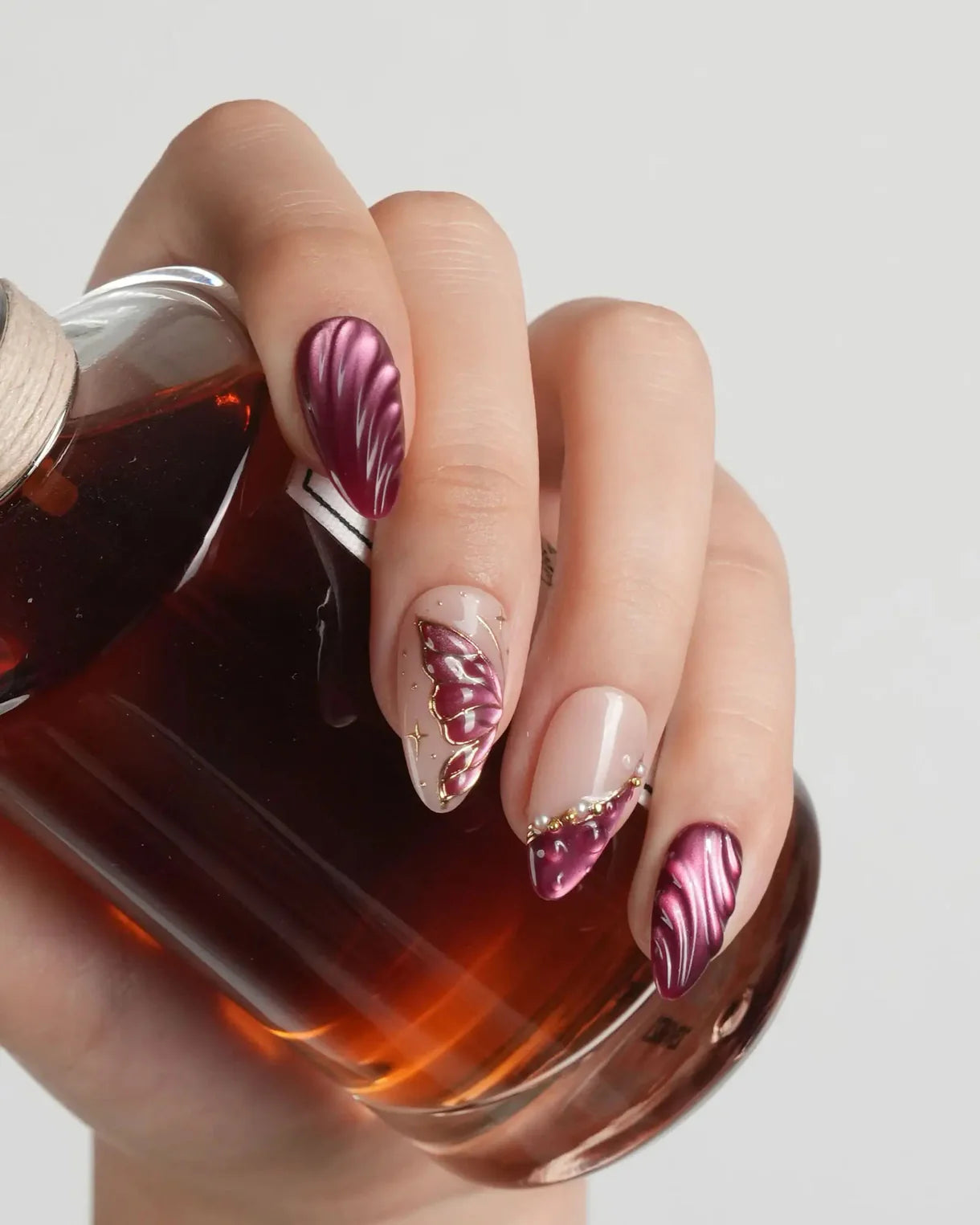 Delicate pink tones and shimmering butterfly accents blend warmth with grace, creating a look that feels both dreamy and confident.
