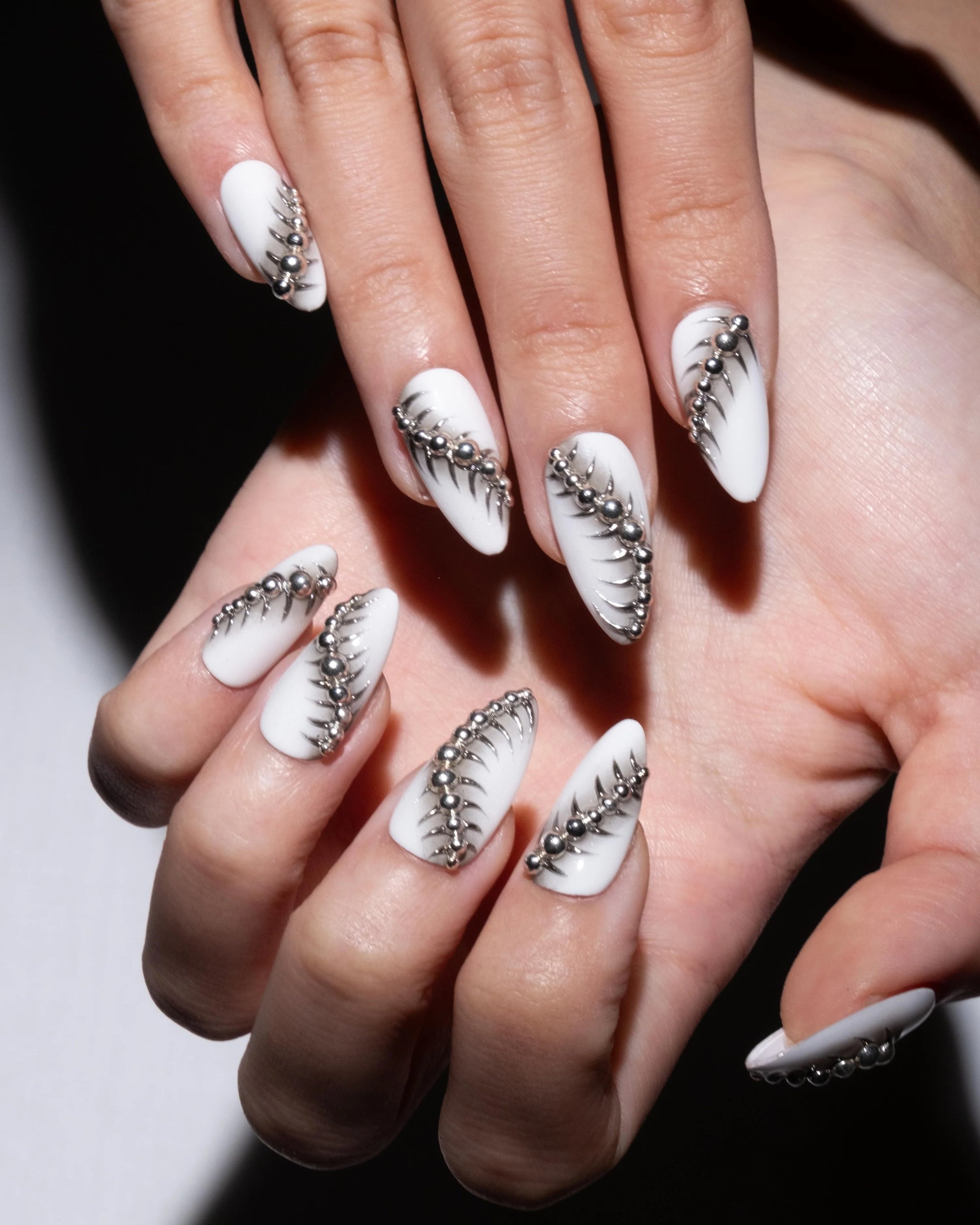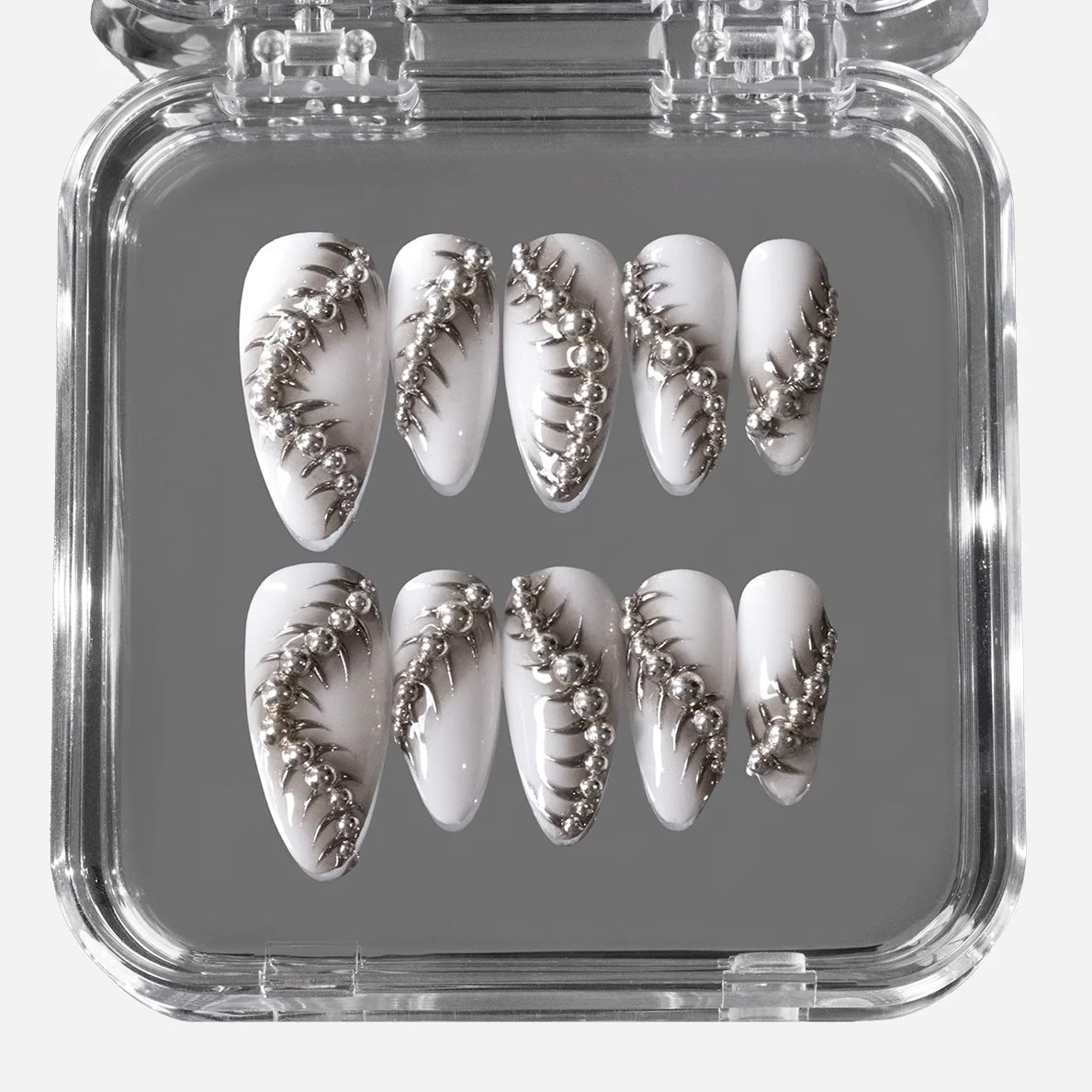 With its sculpted claw shape and metallic bone-like sheen, this set captures the essence of gothic elegance. Each nail links together like a silver spine, symbolizing strength, rebellion, and allure. Perfect for Halloween nights or any time you crave that fearless dark-glam vibe.