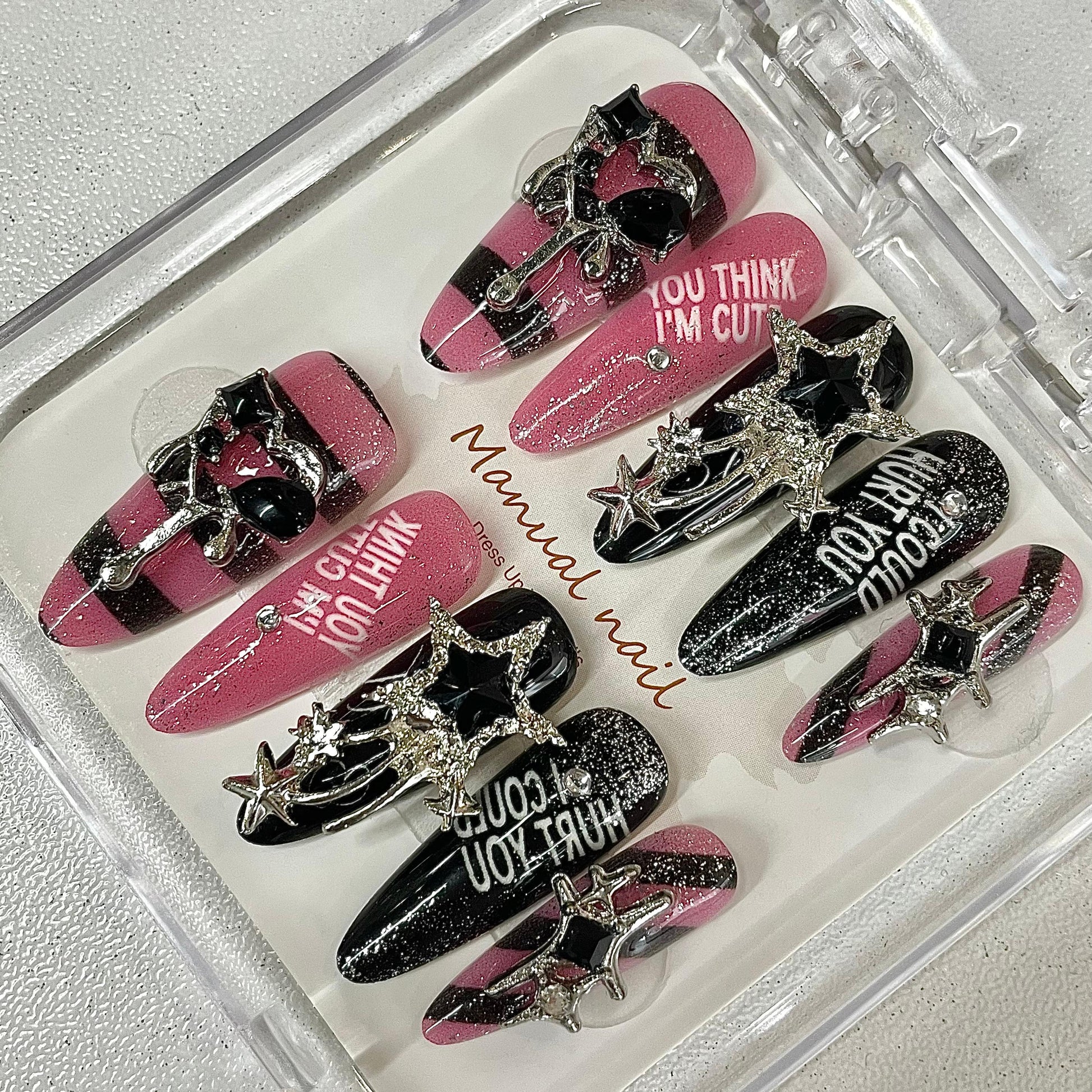 Step into a cosmic dream with Dark Star, our long stiletto press-on nails designed for those who love a bold and enchanting look. The striking contrast of black and pink creates a chic Y2K vibe, while delicate star and heart appliqués sparkle like constellations against the night sky.