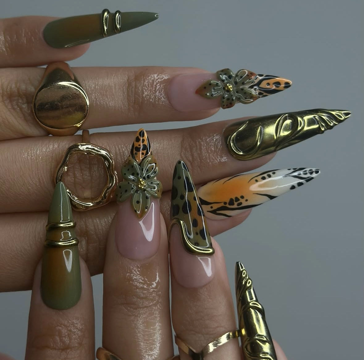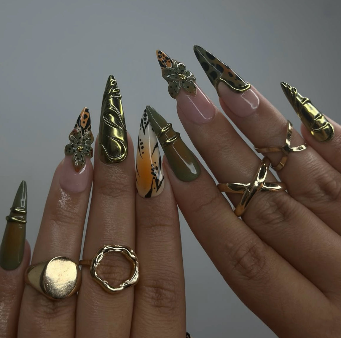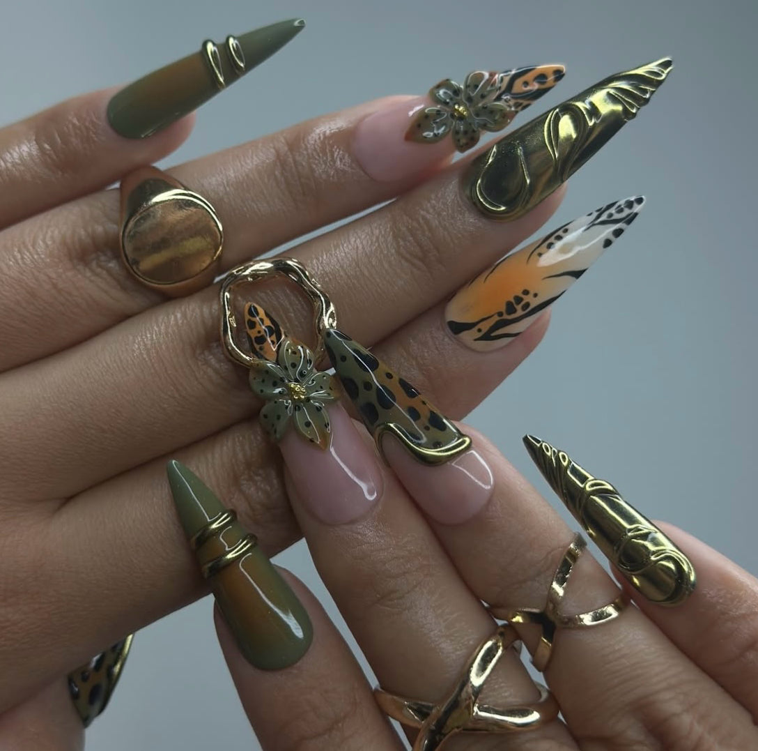 Deep greens and muted golds inspired by the stillness of the autumn woods 🌿✨ Each nail captures the magic of sunlight filtering through leaves — calm, earthy, and effortlessly chic. A must-have for nature lovers and moody-season aesthetics.