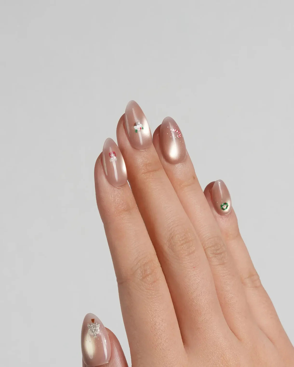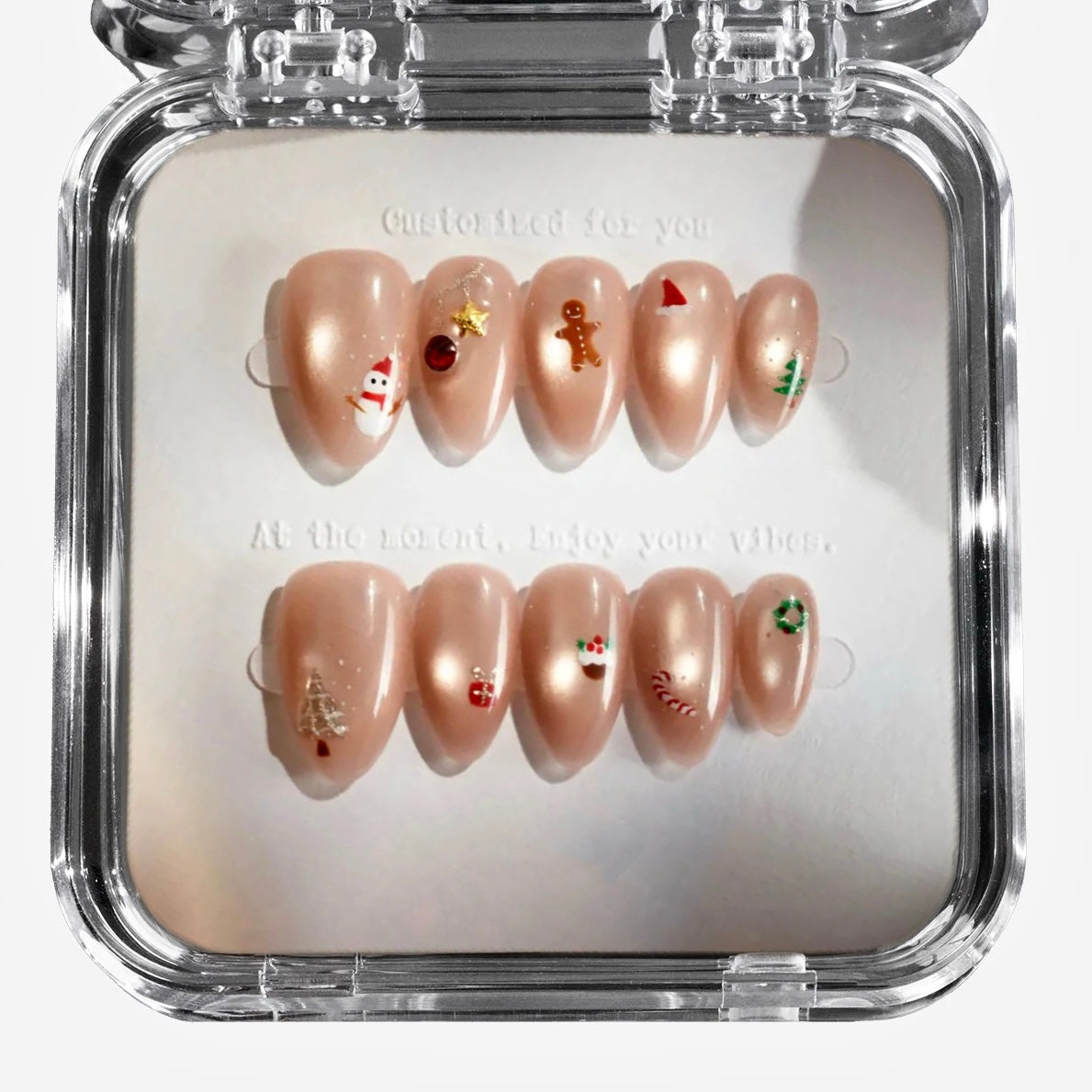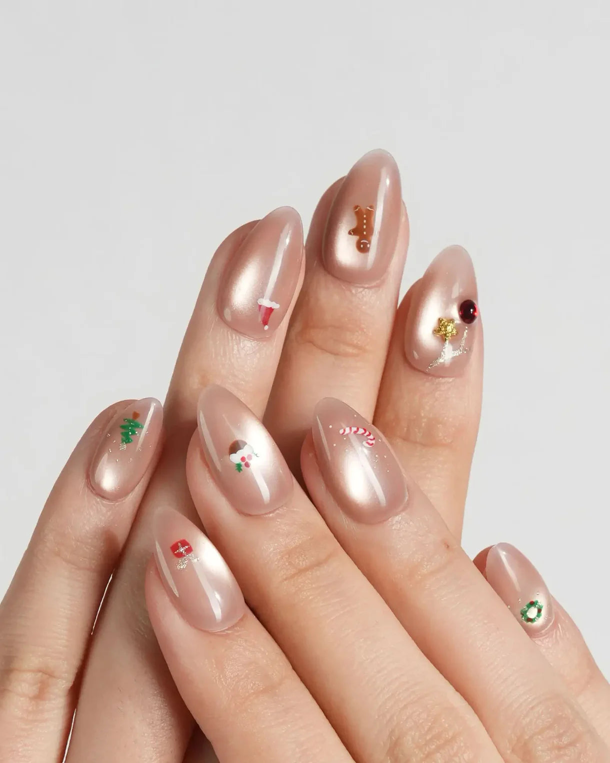 A soft nude base paired with festive icons — snowmen, candy canes, gingerbread, and wreaths — for a cozy yet playful holiday look.