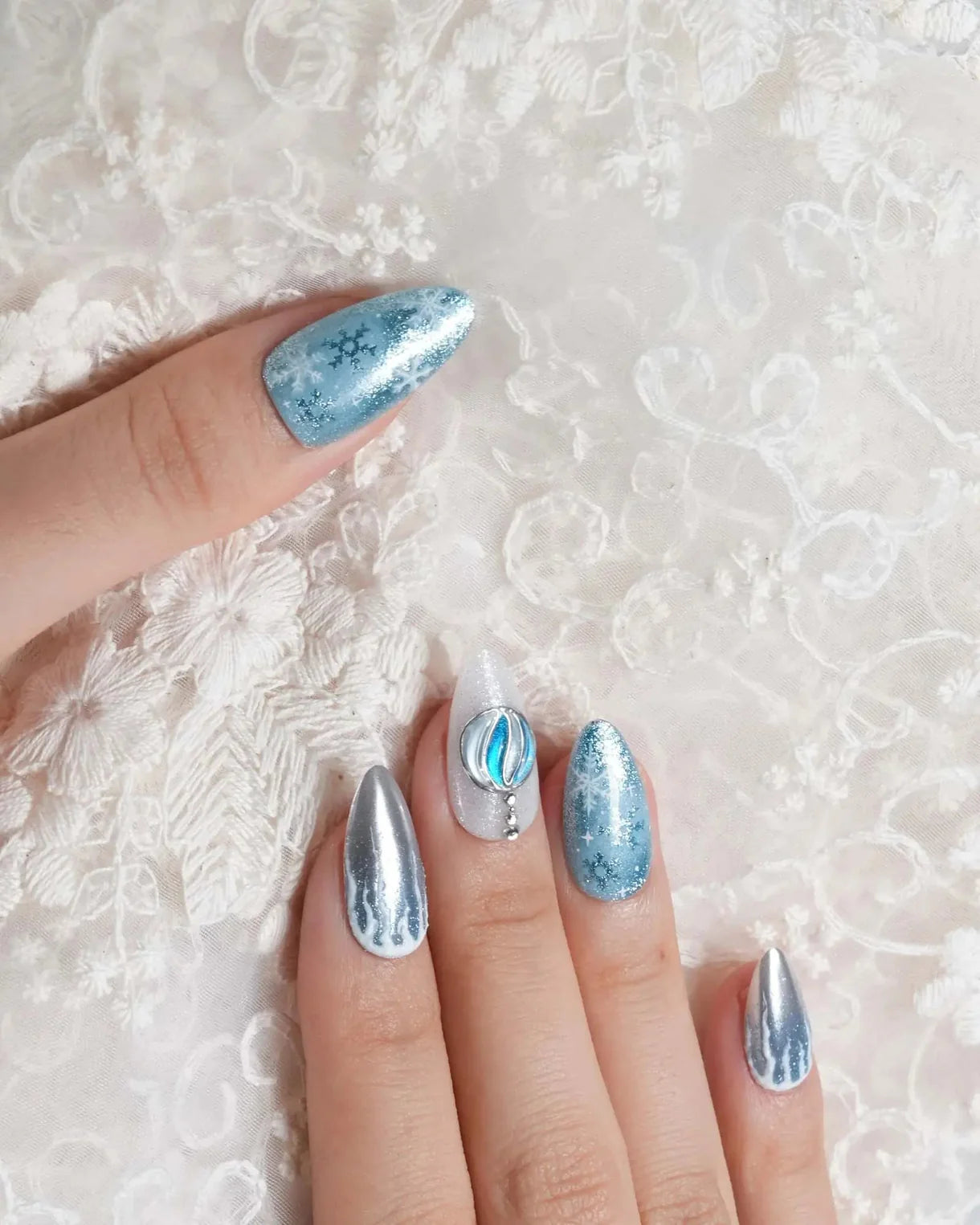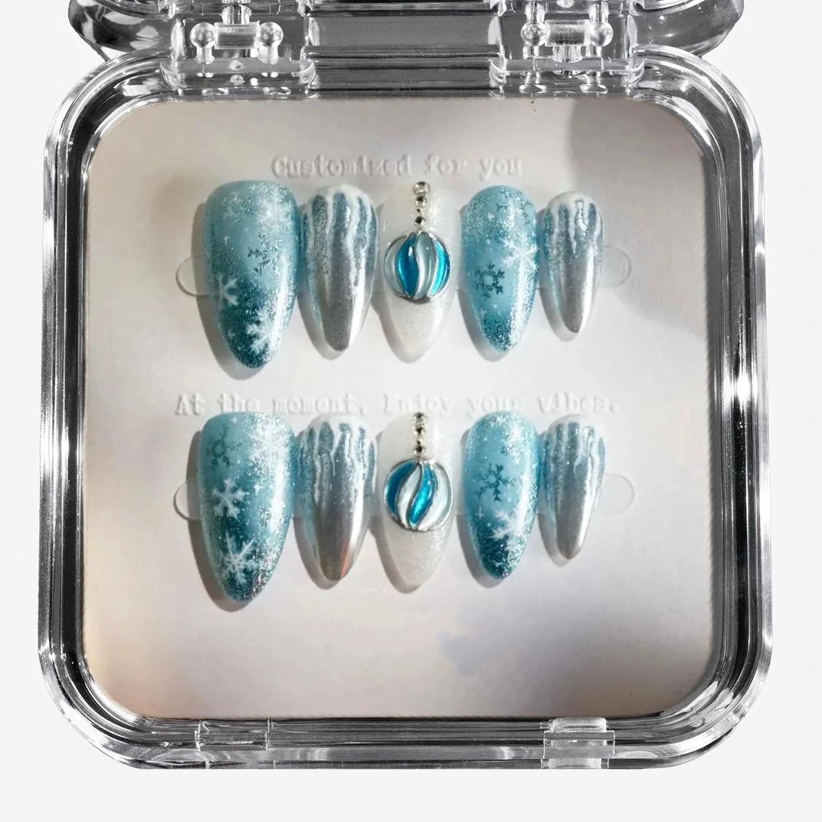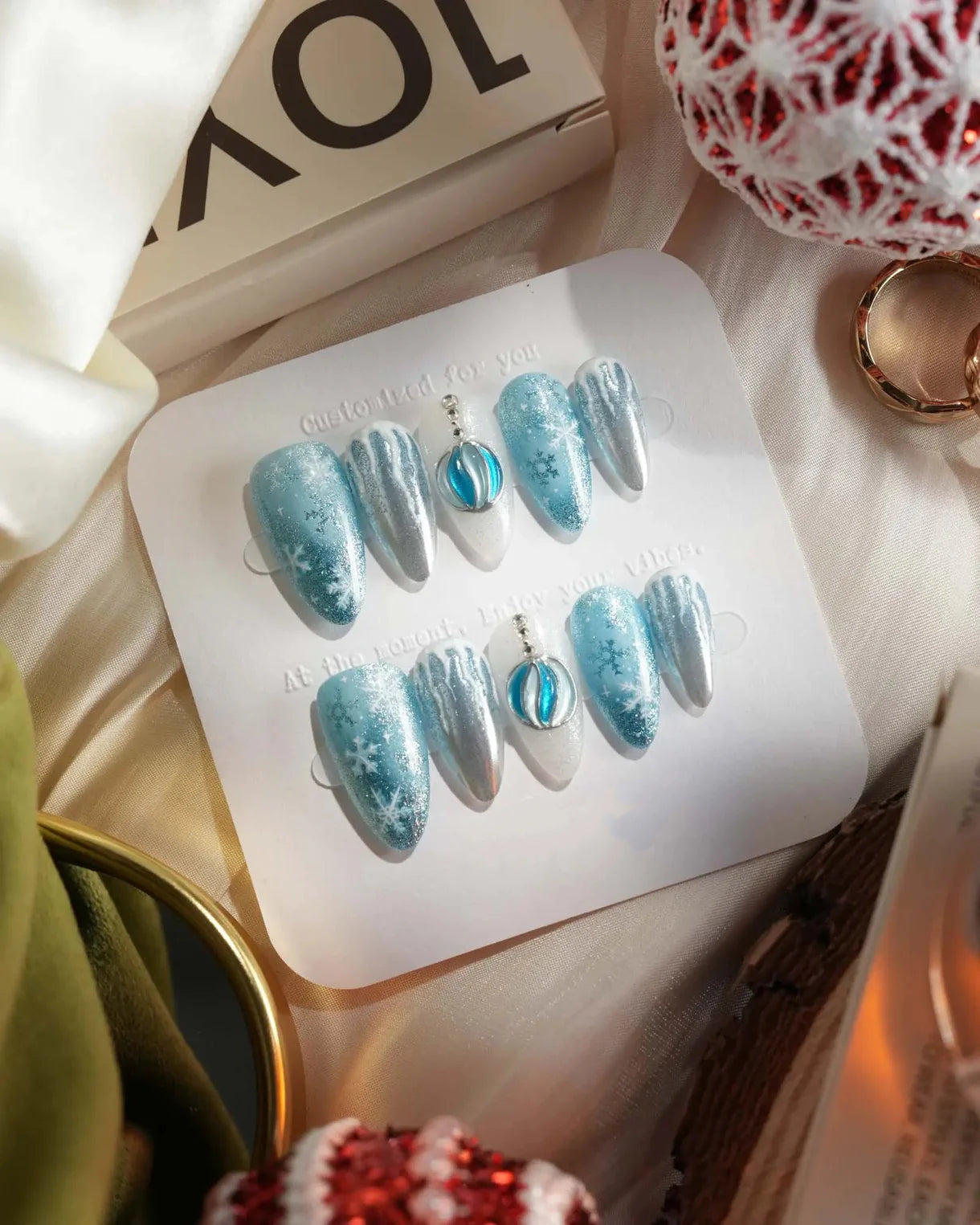 Snowfall brings the cool elegance of winter to your fingertips with a blend of icy blues and shimmering silver. ❄️✨ The delicate snowflake accents add a festive touch, perfect for spreading holiday cheer this season. 🎄💅
